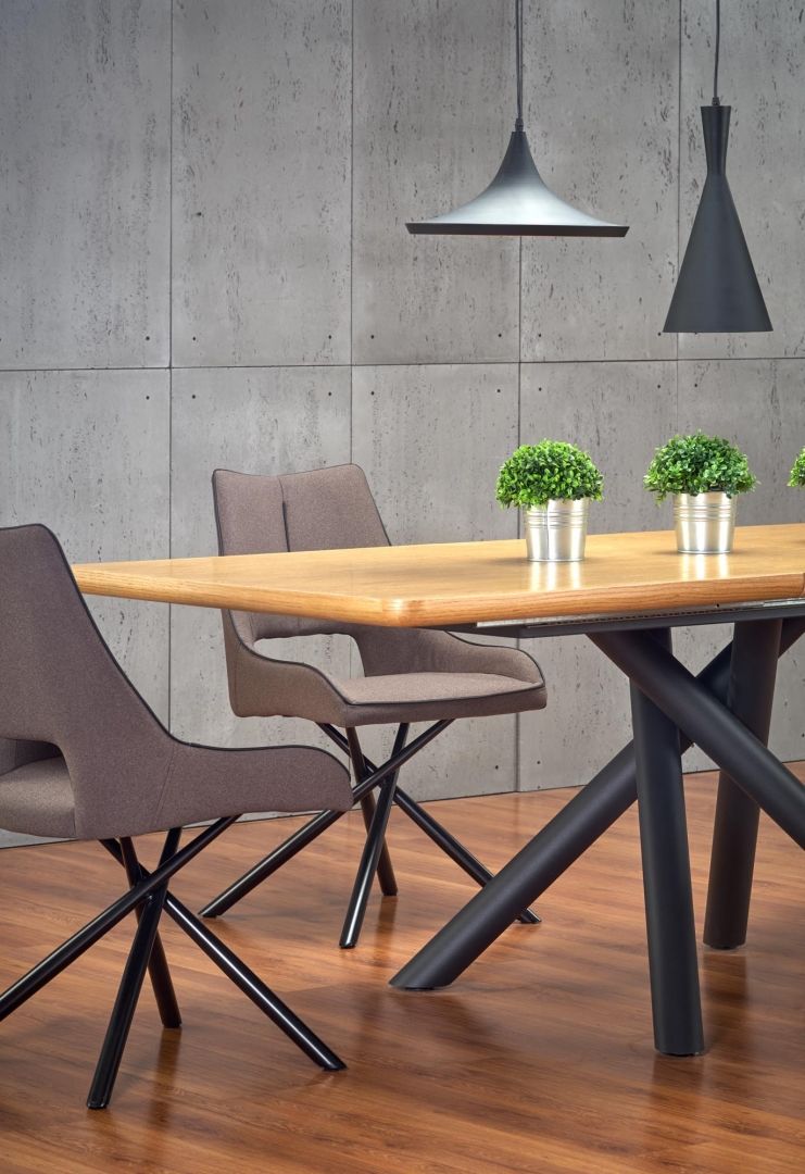 Jídelní stůl DERRICK - je moderní jídelní stůl v kombinaci s dýhovanou přírodní deskou, MDF a ocelovými černými nohami. Stůl je vhodný do moderní jídelny.