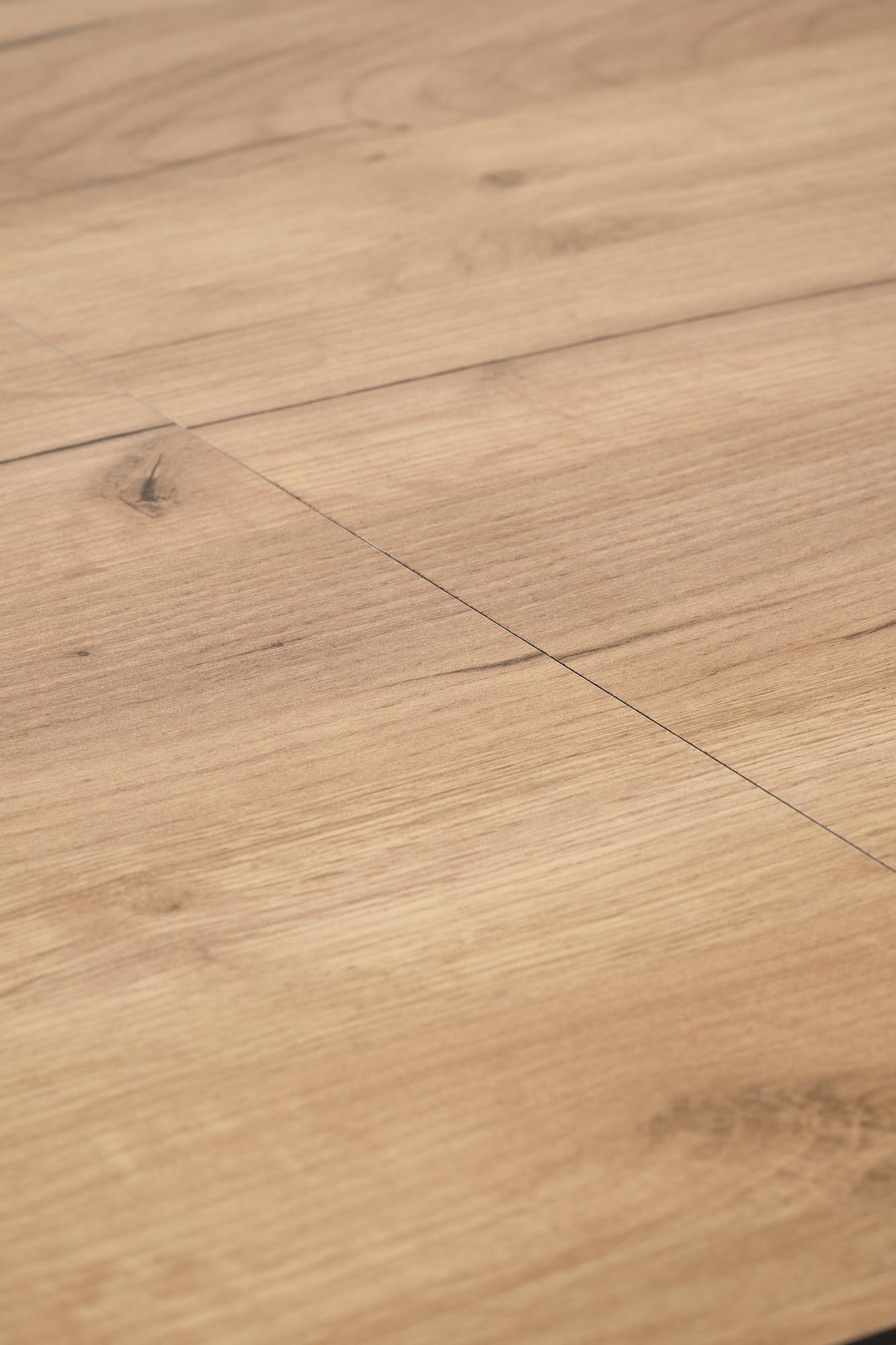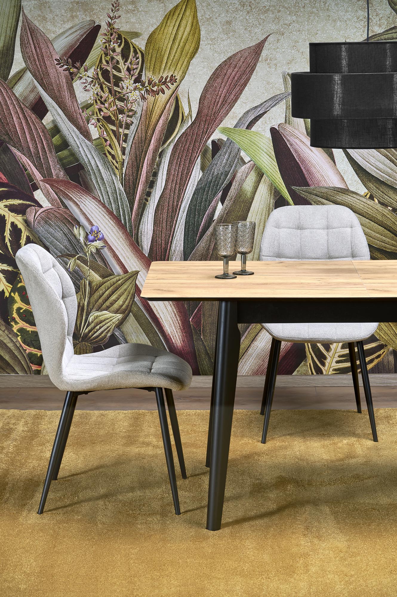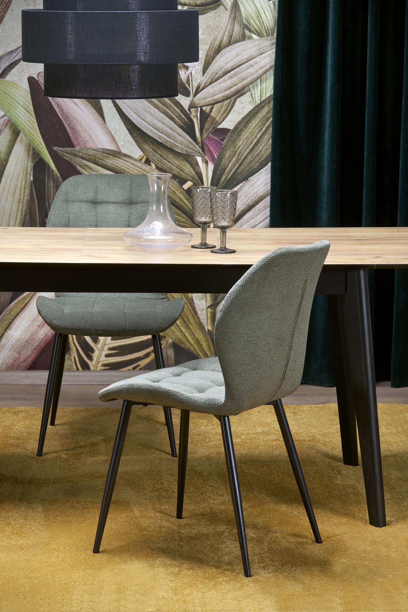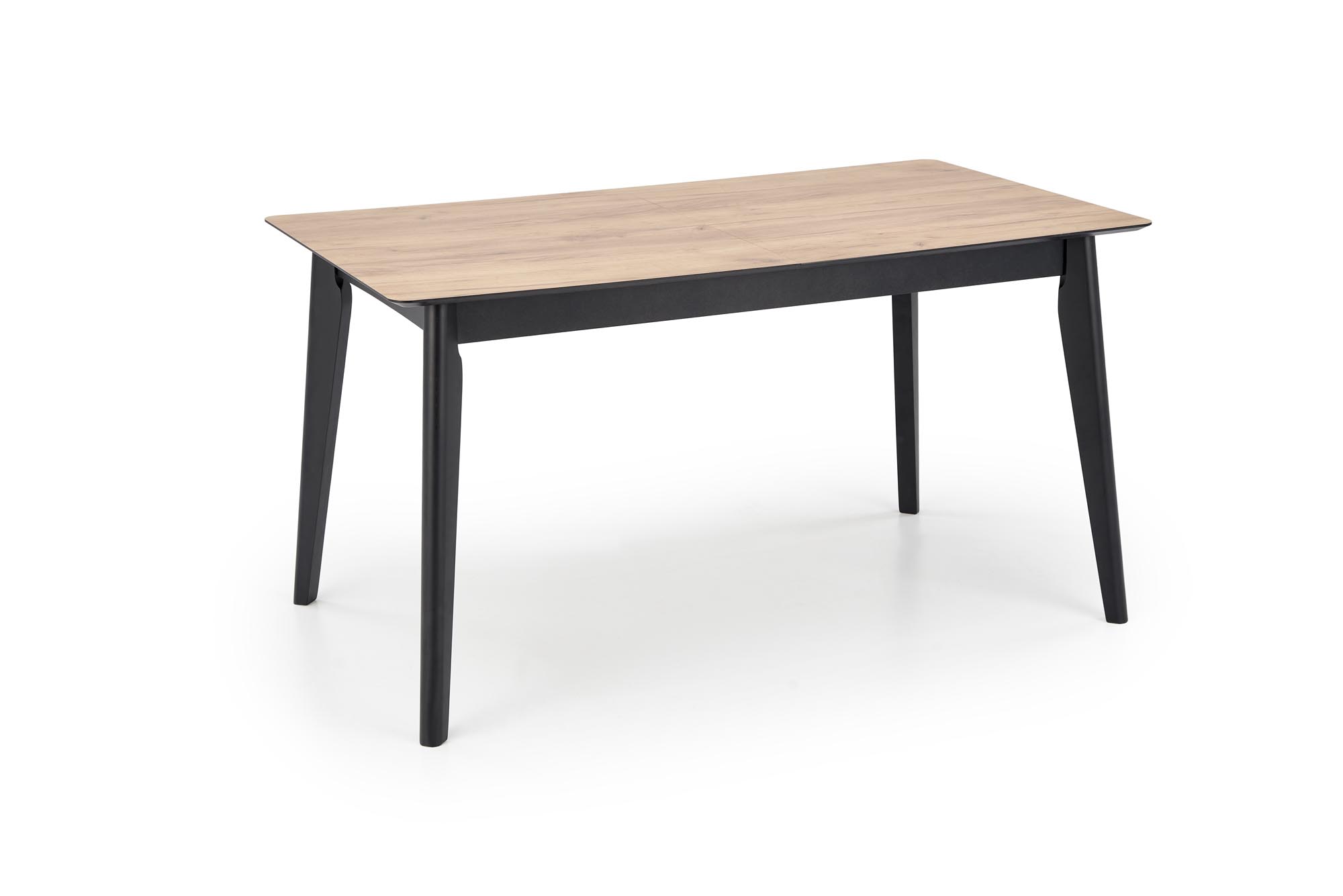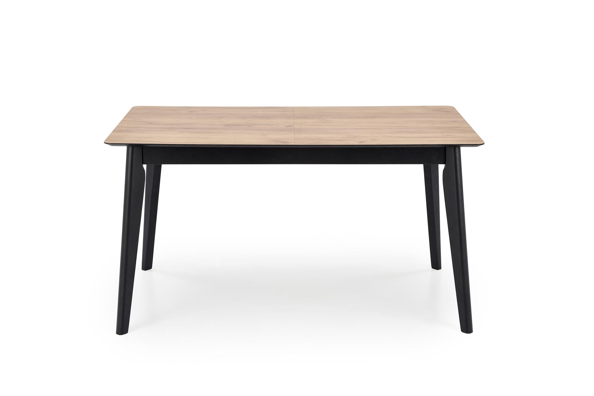 Jídelní stůl GULIAN - je moderní rozkládací jídelní stůl vyroben v kombinaci laminované MDF desky v barvě dubu wotan a černých nohou z masivního dřeva. Tento designový kousek se skvěle hodí do moderní jídelny.