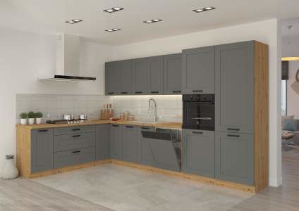 Kuchyňský systém LUNNA TMAVĚ ŠEDÁ / ARTISAN je moderní kuchyňský nábytek, který se hodí do každé kuchyně. Kuchyňskou linku si můžete sestavit z různých typů polic, skříněk, šuplíků a vysokých skříněk.