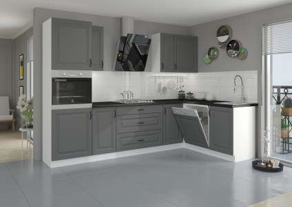 Kuchyňský systém STILLO TMAVĚ ŠEDÁ / BÍLÁ je moderní kuchyňský nábytek, který se hodí do každé kuchyně. Kuchyňskou linku si můžete sestavit z různých typů polic, skříněk, šuplíků a vysokých skříněk.