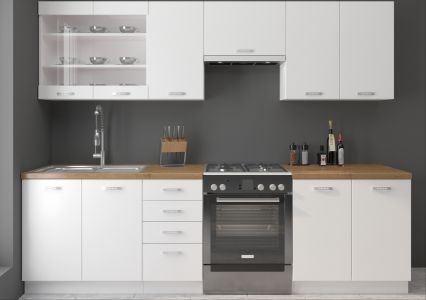 Kuchyňský systém Eko Vhite je moderní kuchyňský nábytek, který se hodí do každé kuchyně. Kuchyňskou linku si můžete sestavit z různých typů polic, skříněk, šuplíků a vysokých skříněk.